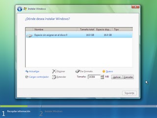 Selecciona la partición en la cuál quieres instalar Vista. Puedes crear una nueva, formatearla, borrarla, ect… Si no quieres complicarte la vida, pulsa Siguiente.