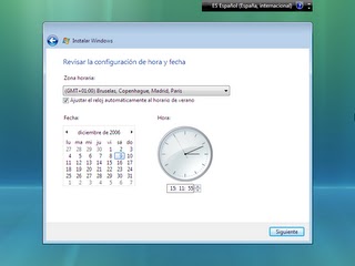 Selecciona tu zona horaria. Por defecto para España es: GMT + 01:00 Bruselas, Copenhague, Madrid, Paris. Si deseas que Windows cambie la hora automáticamente para el horario de verano marca la casilla que hay debajo de la zona horaria. Comprueba que la fecha y la hora son las correctas y pulsa el botón Siguiente.