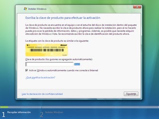 Escribe la clave del producto, sino la tines a mano puedes escribirla más tarde pero deberás saber a que versión corresponde tu clave. Si la introduces más tarde pulsa Siguiente. Te aparecerá una advertencia, pulsa no.